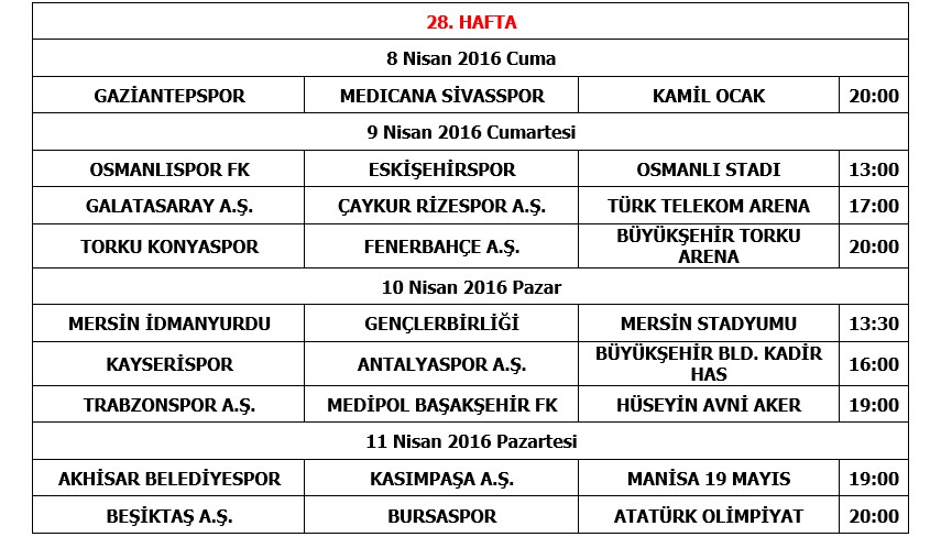 28 ve 29. haftalarda müsabakalar aşağıdaki programa göre oynanacak.