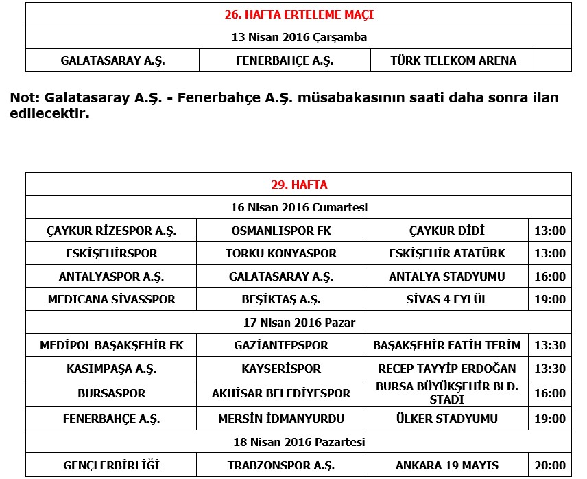 Spor Toto Süper Lig Hasan Doğan Sezonu'nun 26. haftasında ertelenen Galatasaray-Fenerbahçe müsabakasının 13 Nisan 2016 tarihinde oynanacak olması nedeniyle Spor Toto Süper Lig 28. ve 29. haftalarının programlarında bazı değişiklikler yapıldı.