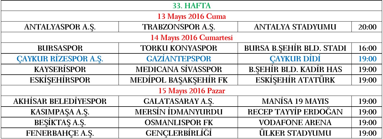 Türkiye Futbol Federasyonu’ndan yapılan açıklamada Çaykur Rizespor’umuzun 13 Mayıs 2016 Cuma akşamı Çaykur Didi stadyumunda saat 20:00’da oynayacağı Gaziantepspor maçı 14 Mayıs 2016 Cumartesi saat 19:00 olarak değiştirildi.