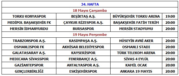 Spor Toto Süper Lig Hasan Doğan Sezonu 34. hafta karşılaşma programı açıklandı. 18 ve 19 Mayıs'ta oynanacak maçların programı şöyle;
