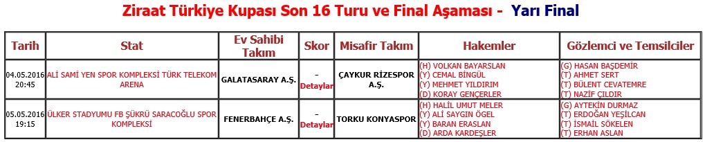Türkiye Futbol Federasyonu Merkez hakem Kurulundan yapılan açıklamada, Ziraat Türkiye Kupası yarı final ikinci maçında Çaykur Rizespor’umuzun Galatasaray ile İstanbul’da oynayacağı maçı Volkan Bayarslan yönetecek. Volkan Bayarslan’ın yardımcılıklarını Cemal Bingül ve Mehmet Yıldırım, yapacak karşılaşmanın dördüncü hakemi Koray Gençerler