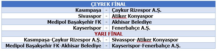 Kura çekimi sonunda çift maç eleme usulüne göre oynacak Çeyrek Final ve Yarı Final eşleşmeleri şöyle oluştu: