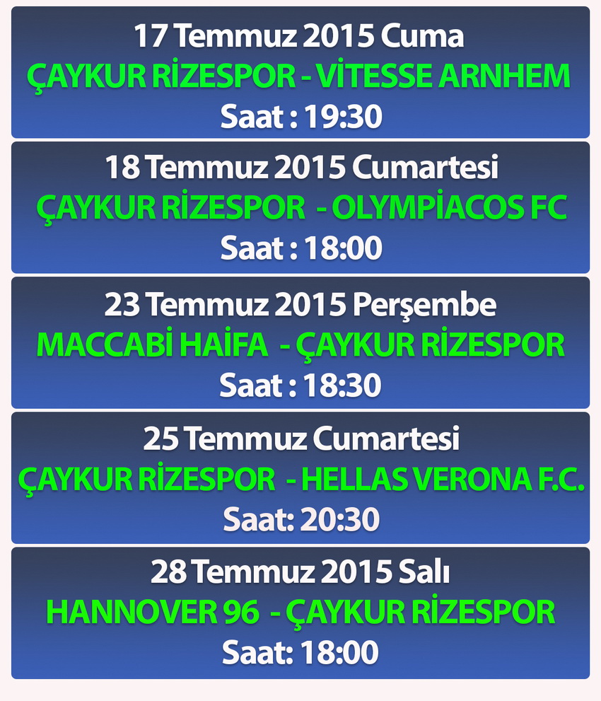 12 Temmuz’da gittiği Avusturya’nın Seefeld kasabasında hazırlıklarını sürdüren Çaykur Rizespor’umuz, hazırlık kampında oynayacağı beş karşılaşmanın programı belli oldu.