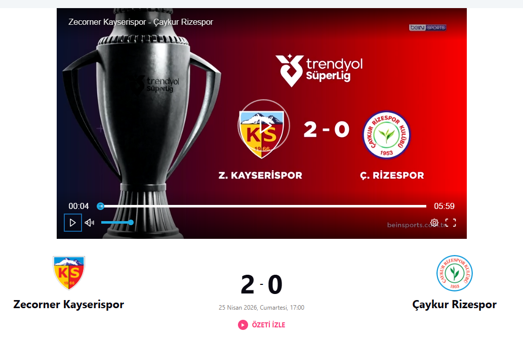 Trendyol Süper Lig’in 31. haftasında Kayserispor, deplasmanda oynadığımız maçta Çaykur Rizespor’umuzu 2-0 mağlup etti.